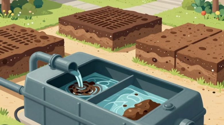 Partially treated water then flows through sloped pipes to the drain field. Here, the soil acts as a natural filter, removing harmful contaminants.